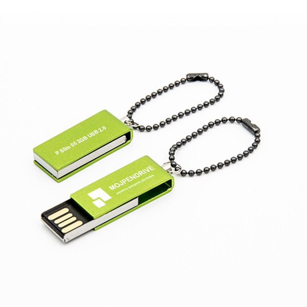 Model P Slim 03 to wykonana z anodowanego metalu obrotowa obudowa skrywająca chip pamięci w wersji mini – umieszczonego w srebrnej chromowanej otoczce. Połączenie wyraźnych kolorów obudowy z chromowanym, srebrnym metalem już samo w sobie przyciąga uwagę.  Pendrive wykończony jest stalowym wkrętem z metalowym kółeczkiem przeznaczonym do zamocowania łańcuszka. Dzięki obrotowej obudowie, pendrive posiada naprawdę niewielkie rozmiary – mimo to doskonale nadaje się do wykonywania znakowania reklamowego.  Na anodowanej powierzchni naniesienie grafiki wykonywane jest grawerem laserowym – wykonane w ten sposób znakowanie uzyskuje idealnie śnieżnobiałą barwę idealnie widoczną na tle kolorowej obudowy.  Niewielki rozmiar pendrive nie stanowi najmniejszej przeszkody by wyposażyć go chip znacznej pojemności – nawet do 64 GB pojemności.